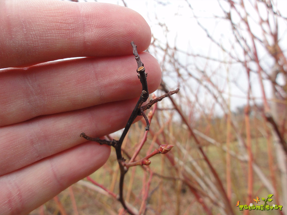 Črnenje konice poganjka, ki je suhi ostanek lanske pecljevine, kjer je bil pridelek. Poleg opazimo poganjek s cvetnim brstom, ki bo letos cvetel in rodil.