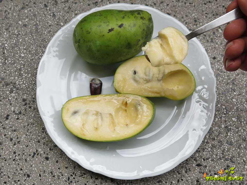 Na sliki plod asimine Prima. Meso uživamo z žličko. Občutek tropske svežine. Okusno in zelo sladko. Dober tek!