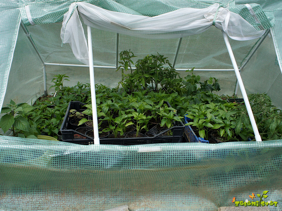 Utrjevanje domačih sadik v manjšem `rastlinjaku`. Sadike aprila prenesemo v zaščiten prostor, da preprečimo pretegnjenost. Pozorni smo na nizke temperture in neugodne vremenske dejavnike (dež, sneg, pozeba).
