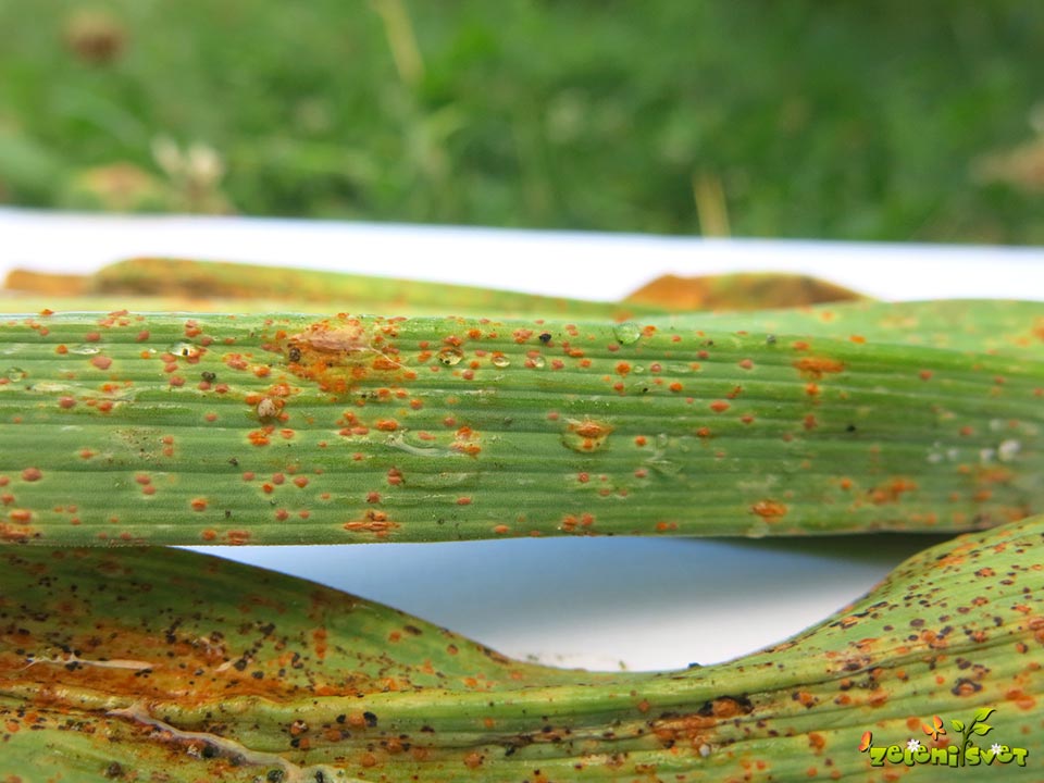 Na listih opazimo česnovo rjo. Oranžno rdeči kupčki letnih trosov niso nevarni za pridelek in jih ne zatiramo.