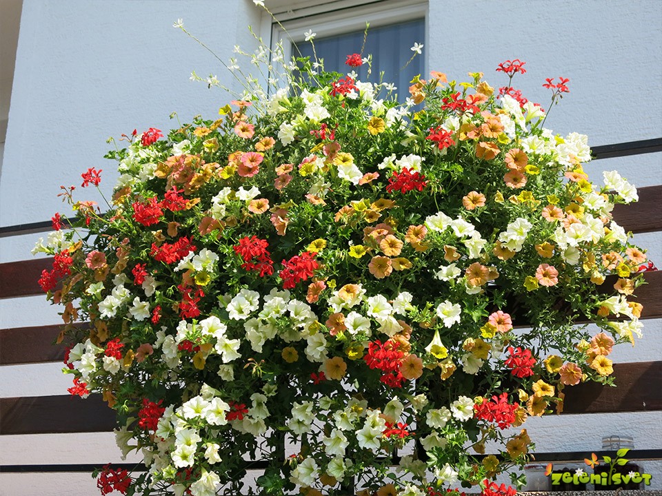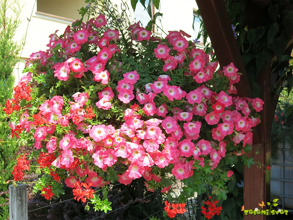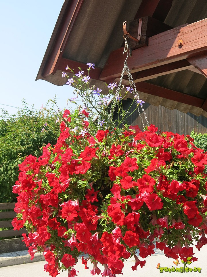 Surfinija Trailing red se lepo obnaša v obešanki in zasaditvi v koritu. Surfinija sorta Coral Morn se dobro razrašča med rdečo bršljanko.