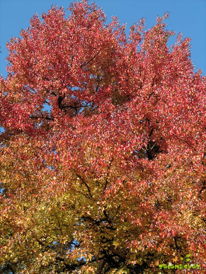 Bolj izrazito se obarvajo vrste iz Severne Amerike in Azije. Gozdovi v Ameriki, kjer uspeva rdeči javor (Acer rubrum) dobesedno zagorijo v intenzivni rdeči barvi. Na fotografiji žari ambrovec v oranžno – rdeči barvi.