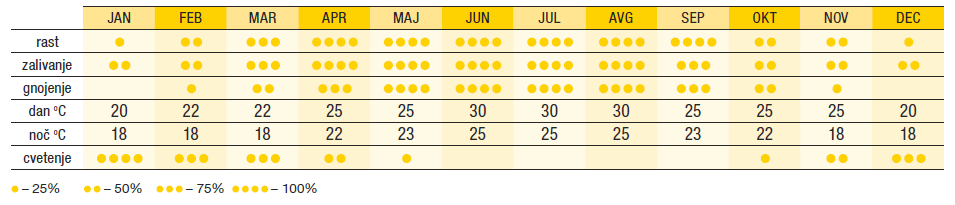 To pomeni, da bomo v zimskih mesecih omejili zalivanje, saj traja dlje časa, da se substrat v lončku popolnoma presuši. Prilagoditi je treba tudi gnojenje, ki ga lahko popolnoma prekinemo za vsaj dva meseca, kot je to razvidno iz spodnje razpredelnice.