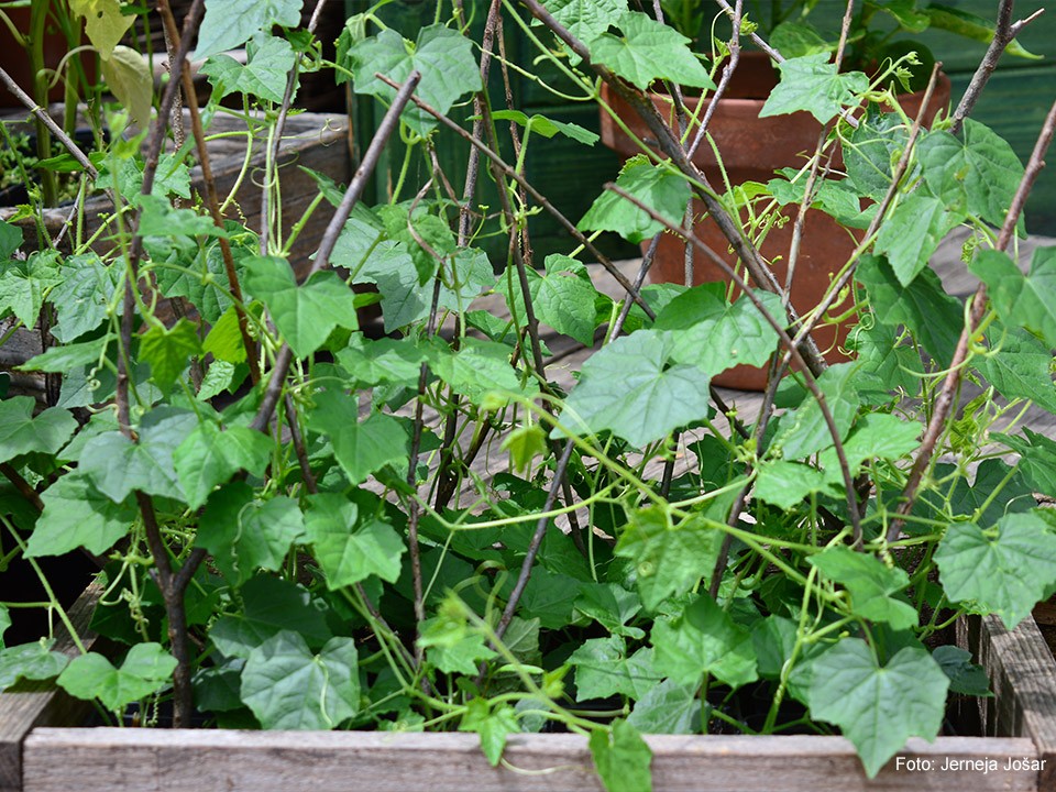 Pridelek pobiramo sproti. Dognojujemo s tekočimi gnojili. S kumarami bomo na ta način lahko pridobili nekaj sence, ali pa nas bo zastor zakril pred radovednimi pogledi.