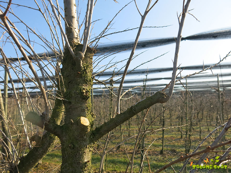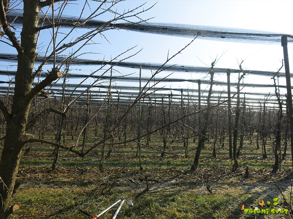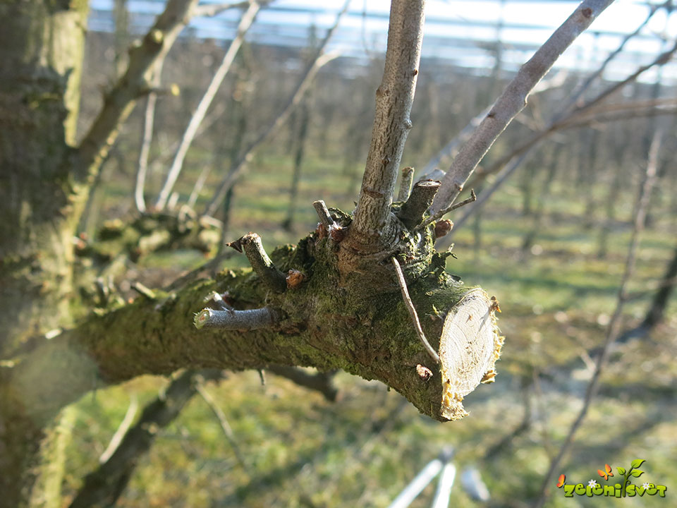 Drobne poganjke na ogrodnih vejah izrežemo. Na drobnih poganjkih ne pričakujemo kakovostnega pridelka. Drobni poganjki gostijo in senčijo krošnjo, zato jih temeljito razredčimo.