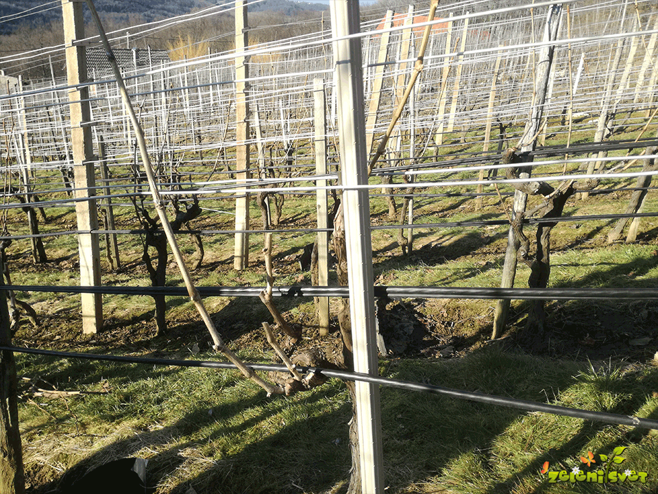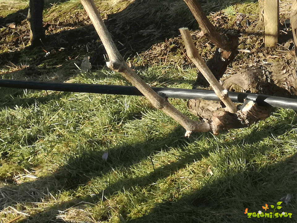 Dolge poganjke upogibamo in privezujemo, da omogočimo enakomerno rast poganjkov, ki bodo rodili to leto. Novi poganjki iz šparona, ki se razraščajo navzgor se usmerjajo med žice.