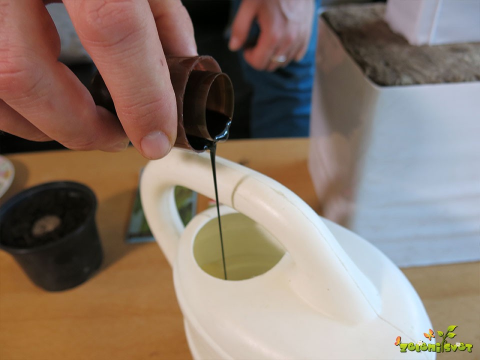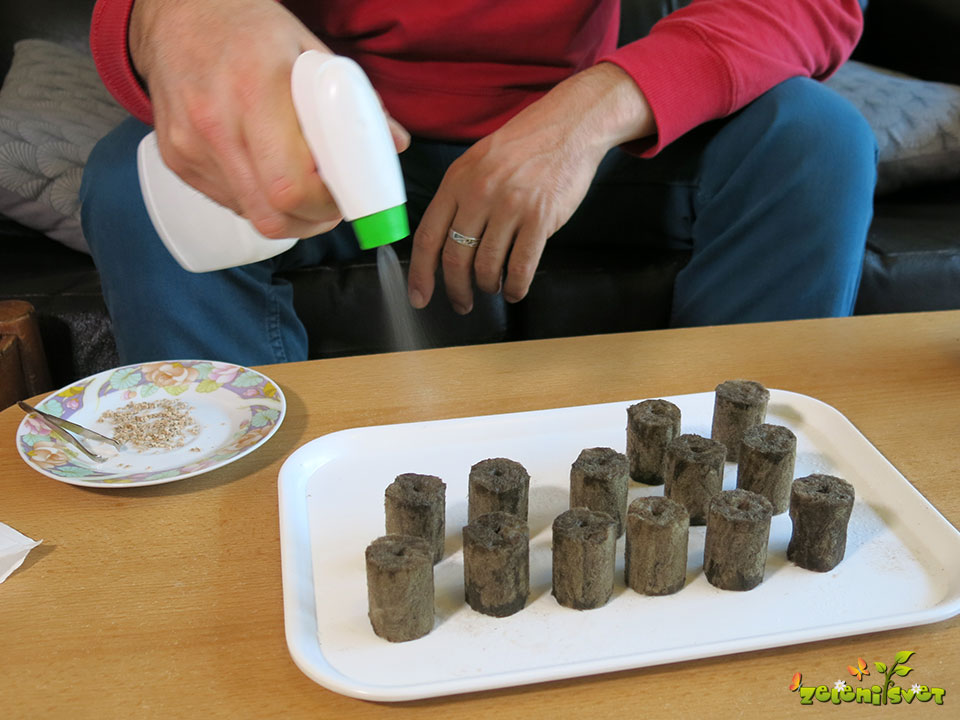 Čepke postavimo na pladenj in pršimo z vodo, ki smo ji dodali hranila (alge, hitro dostopna hranila). Čepke v katero smo sejali seme pršimo zmerno, da se bolje razvije koreninski sistem. Predlagamo, da jih pršite z vseh strani tako, da ob stisku spodnjega dela čepka od njega ne kaplja.
