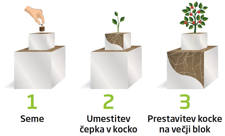Seme paradižnika in ostalih plodovk sejemo v čepek in pršimo. Ob pojavu prvega pravega lista rastlino s čepkom postavimo v kocko. Ostalih sadik (solata, zelje, …) ni potrebno presajati in jih s čepkom takoj po setvi postavimo v kocko.