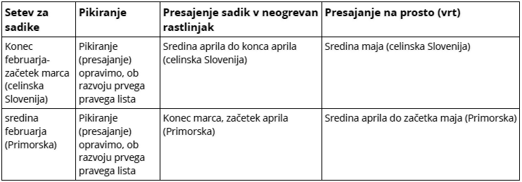 Sadika potrebuje za razvoj 60 do 70 dni. Več o optimalnem času setve, pikiranja, presajanja sadik v rastlinjak in vrt si lahko preberete v nadaljevanju (tabela).