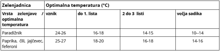 Tabela 2: Optimalna temperatura za vzgojo sadik paradižnika, paprike, feferonov, čilijev, jajčevcev
