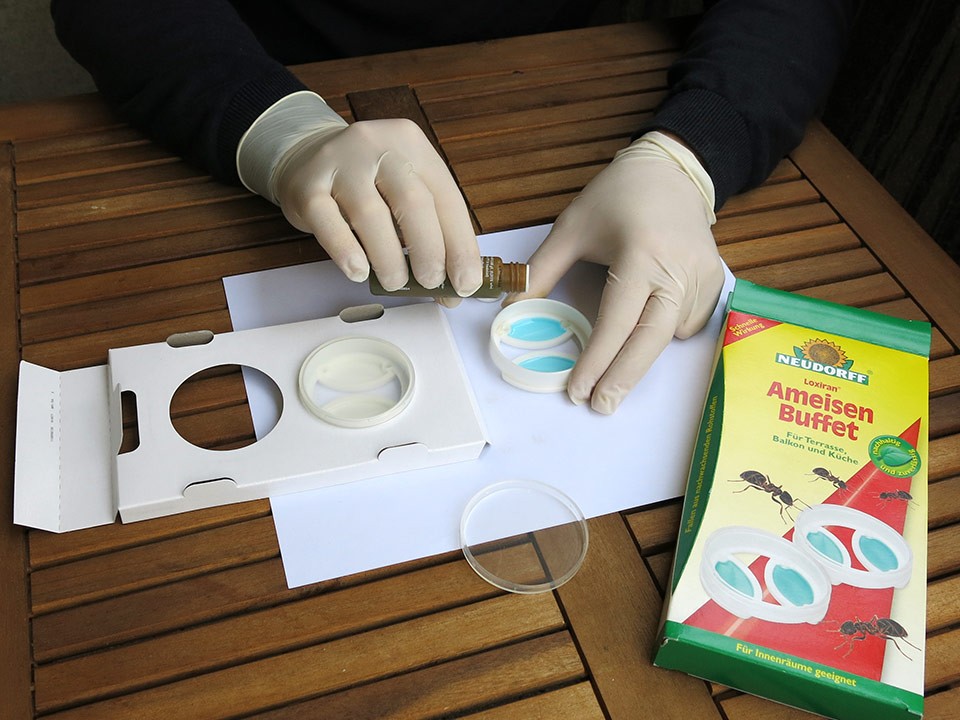 Vabe za mravlje ne postavimo direktno na sonce, saj bi s tem bi pospešili prehitro izsušitev. Na soncu se vaba obarva modro, kar je znak da je postavljena na napačno mesto. V vsako plastenko previdno nalijemo 5 ml vabe in pokrijemo s pokrovčkom.