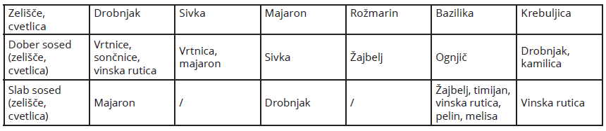 Tabela 1: Dobre in slabe kombinacije med zelišči in cvetlicami