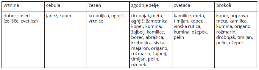 Tabela 2: Dobri sosedje (zelišča in cvetlice) čebule, česna, zgodnjega zelja, cvetače in brokolija