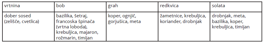 Tabela 3: Dobri sosedje (zelišča in cvetlice) boba, graha, redkvice in solate.