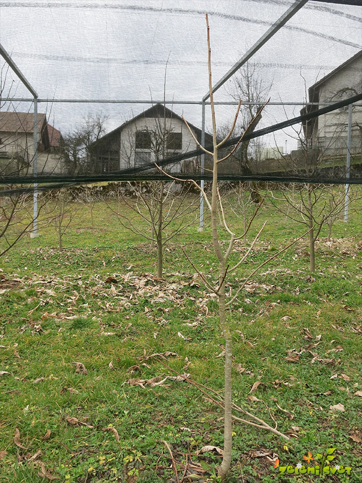 Jeseni ali spomladi sajene sadike prikrajšamo na višino 70 do 80 cm. Tako določimo prvo etažo vej na 50 do 60 cm, ter pustimo 30 cm prikrajšanega vrha nad predvidenimi prvimi vejami.