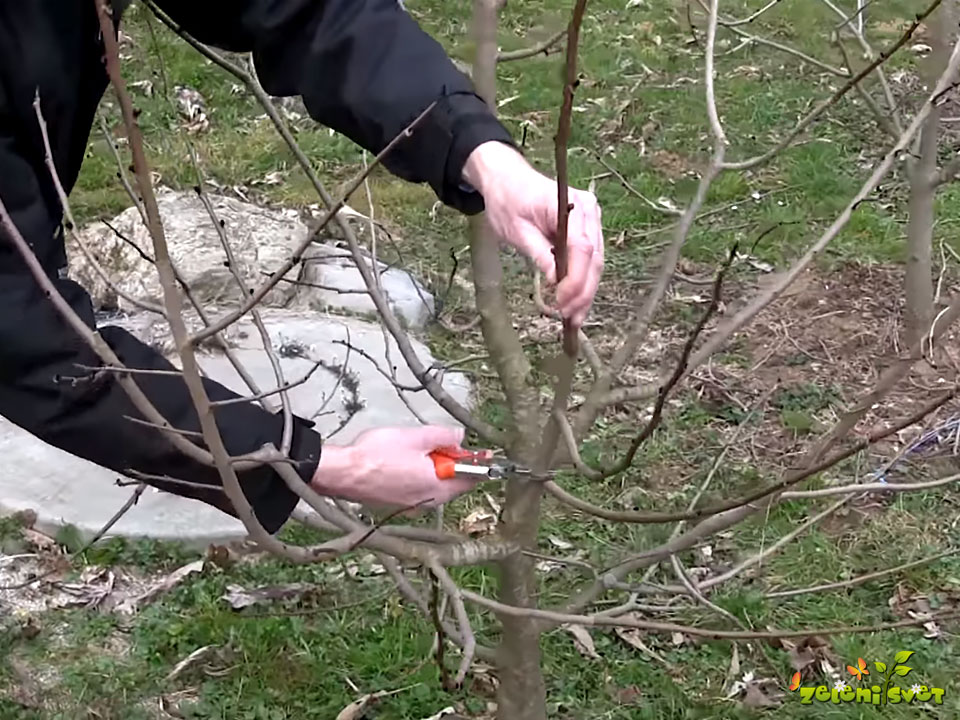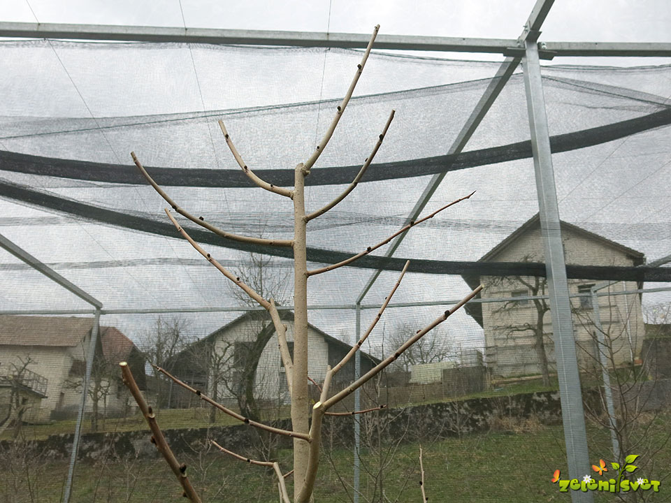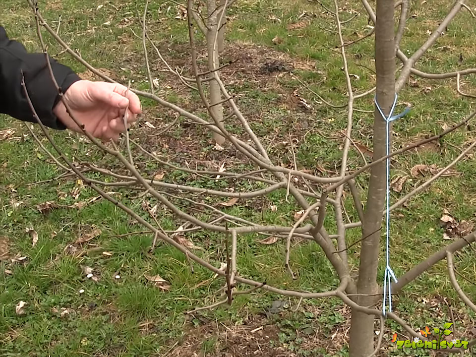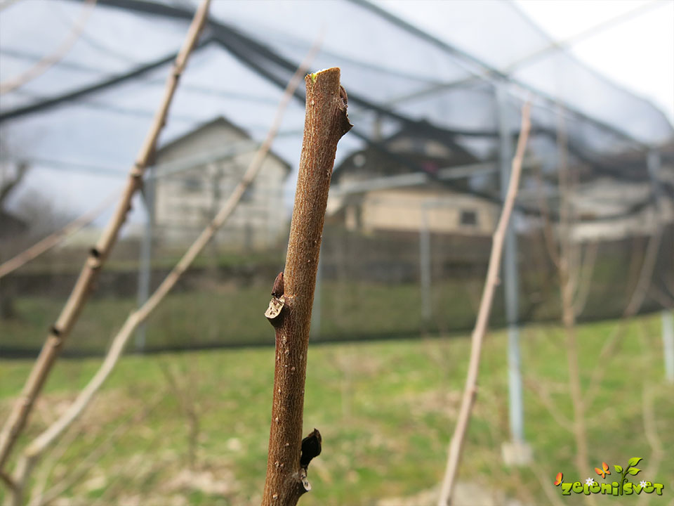 Na rodni veji puščamo v spodnjem delu veje cvetne brste in v zgornjem delu prikrajšamo na 1 do 2 vegetativna brsta.