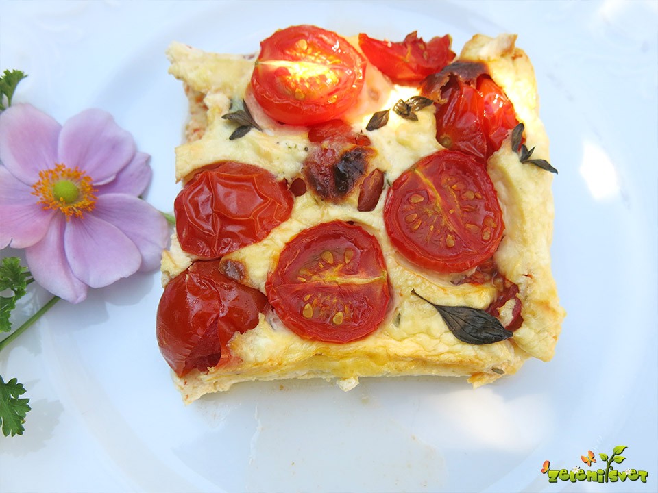 Zmes naložimo v posodi, prst pod vrhom, ker mora ostati še prostor za paradižničke, ki jih potisnemo v nadev, pa tudi zato, ker bo vsebina med peko narasla. Cele majhne češnjevce potisnemo bolj globoko v nadev. Na vrhu pustimo prepolovljene paradižnike, ker se lepše zapečejo.