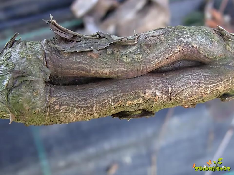 V preteklosti poškodovan poganjek. Pri delu z orodjem (kosa nitkarica, škarje) moramo biti zelo pazljivi, da ne poškodujemo lesa.