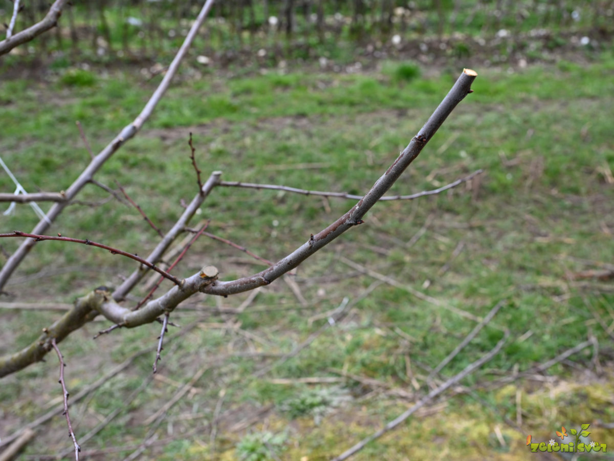 Enoletni poganjek odvedemo na primeren, nižje rastoči brst, da umirimo rast in ohranjamo rodnost v notranjosti krošnje.
