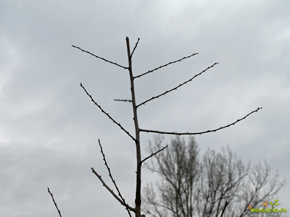 Izberemo en vrh, da sledimo naravni rasti debla in uravnotežimo drevo. Izločimo vse konkurenčne poganjke, ki z njim tekmujejo.