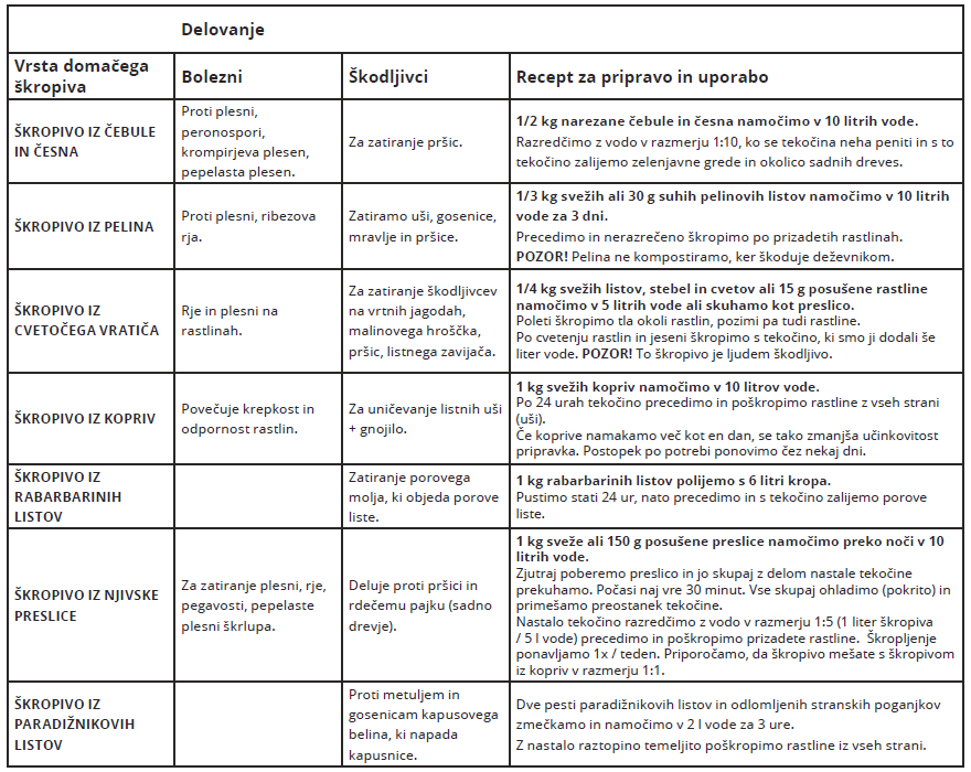 Tabela 1.: Domača škropiva po vrstah rastlin, načinu delovanja in receptu za pripravo in uporabo (KLIKNI NA TABELO ZA POVEČAVO):