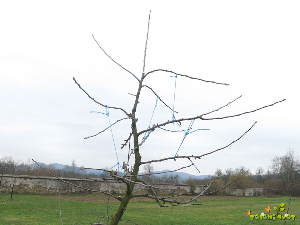 Po rezi jablane smo poskrbeli za upogibanje vej v zgornjem delu krošnje, ki smo jih z vrvico privezali v vodoravni položaj. Tako smo umirili rast in poskrbeli , da se bodo med letom obrasli s kratkimi poganjki (brstiči, brstike), ki bodo rodili v prihodnjem letu.