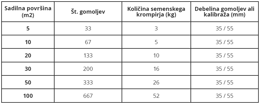 Iz tabele preberemo, da je za 5 m2 potrebno saditi 33 gomoljev zgodnjega krompirja. To število gomoljev najdemo v 3 kg pakiranju debeline 35 do 55 mm.