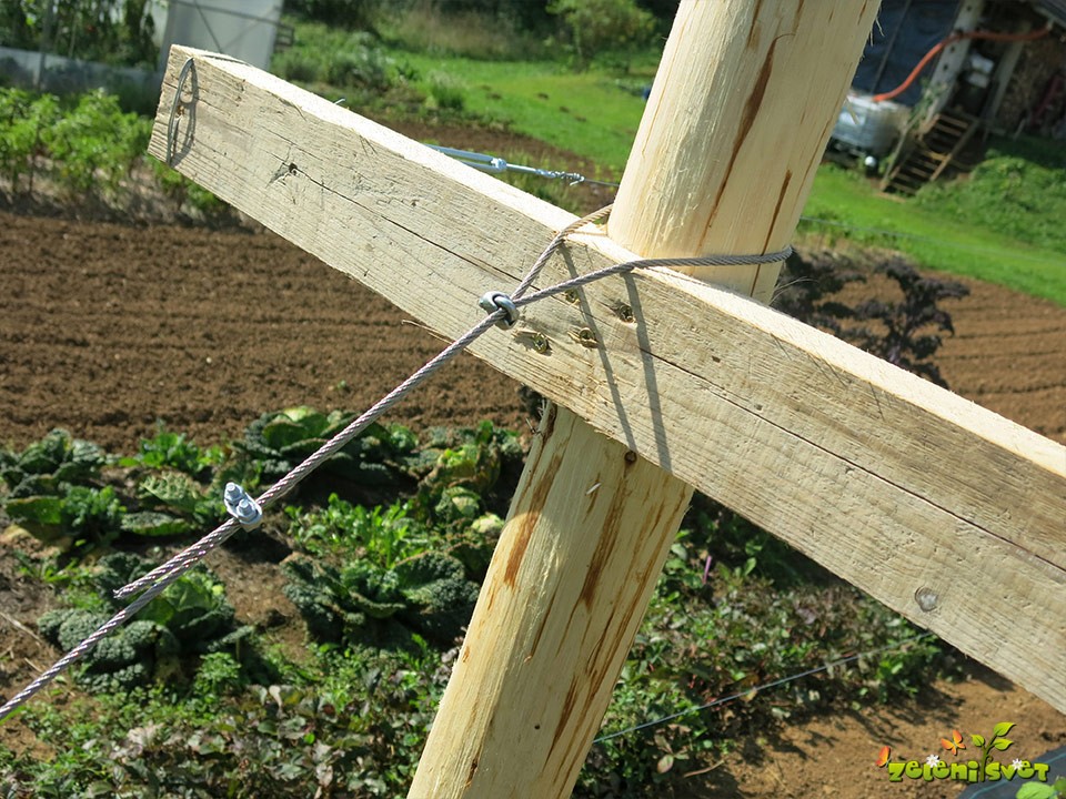 Prva prečna letev je v našem primeru pritrjena na višino 0,6 do metra od zemlje, druga pa 1,6 metra od zemlje. Na vsako stran prečne letve smo napeli po eno pocinkano žico.