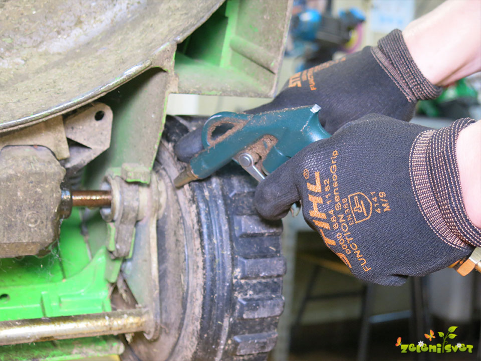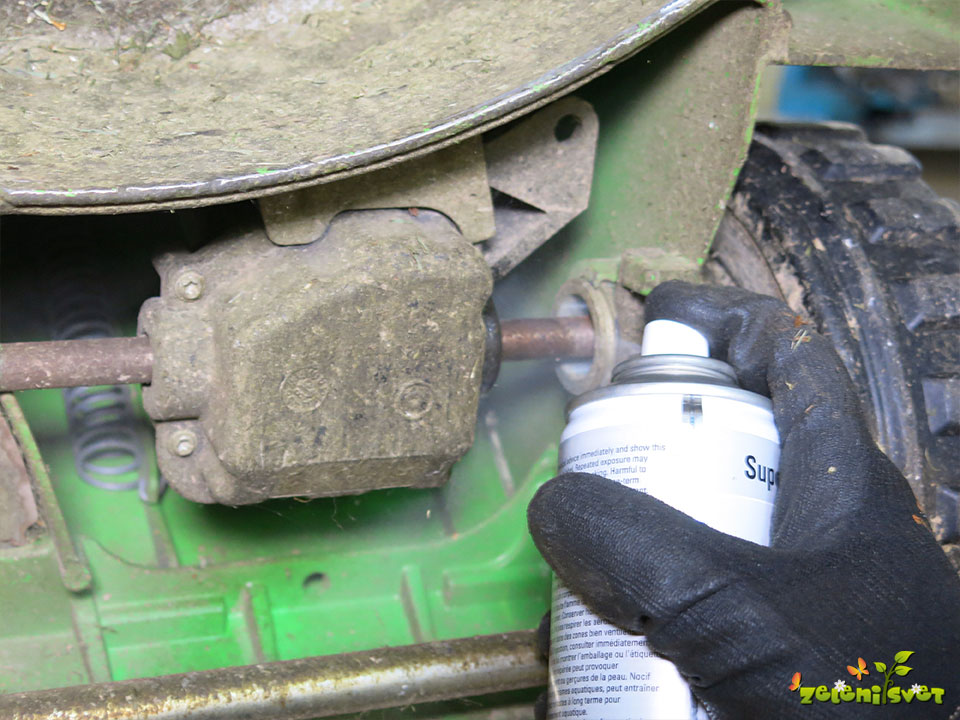 S kompresorjem očistimo osovino in jo zaščitimo s protikorozivnim sredstvom v razpršilu. Poskrbimo tudi za to, da podmažemo zobnike na kolesu. V tem primeru uporabimo litijevo mast za mazanje. Preverimo tudi ležaje koles in jih po potrebi zamenjamo.