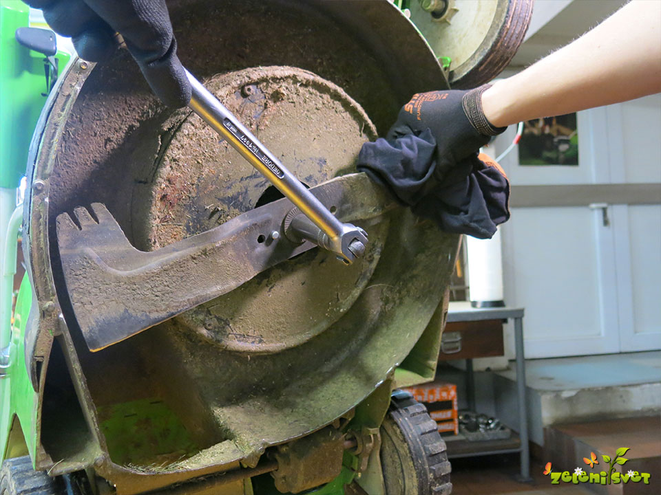 Na ročaj za nasadne ključe nasadimo ustrezno velik nasadni ključ. Rezilo s krpo močno primemo in z nasadnim ključem odvijačimo vijak rezila. Po tem lahko odstranimo rezilo.