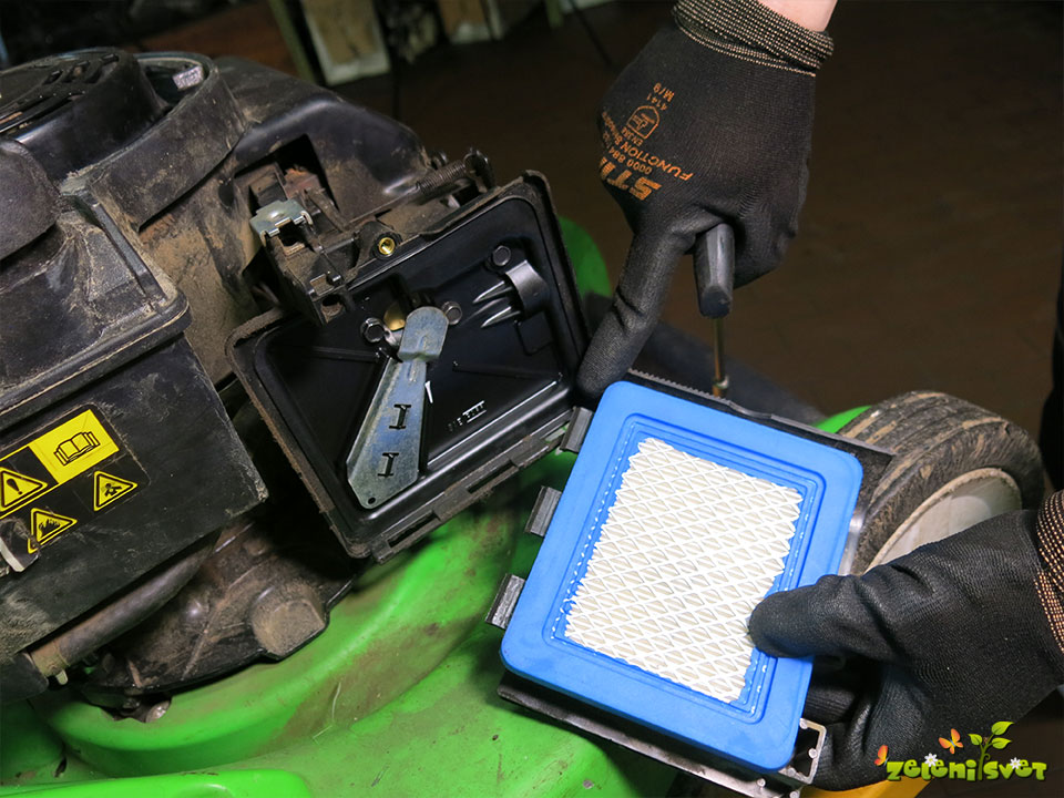 Nosilec filtra in pokrov filtra temeljito očistimo in pazimo, da nam umazanija ne uide v sesalni del motorja. Po čiščenju nosilca vzamemo nov filter zraka, ga vstavimo v nosilec in pokrijemo s pokrovom.