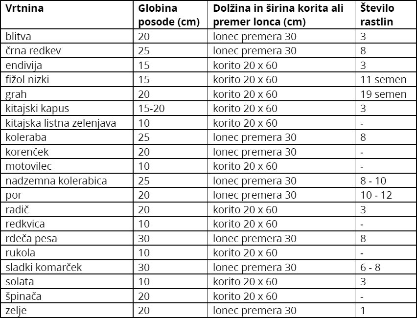 V spodnji razpredelnici so prikazane mere posod in približno število sadik (pri fižolu in grahu semen).