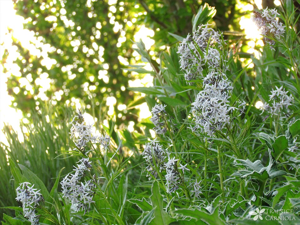Amsonija je ameriškega porekla in še vedno malo manj znana, a izredno lepa in dolgoživa trajnica. Gojimo več vrst, vse pa tvorijo malo razvejane zelnate poganjke z vrbam podobnimi listi. Maja in junija zacvetijo v najnežnejši modri barvi z drobnimi zvezdastimi cvetovi. Tudi v najhujši vročini ne ovenijo, jeseni pa se čudovito zlatorumeno obarvajo.