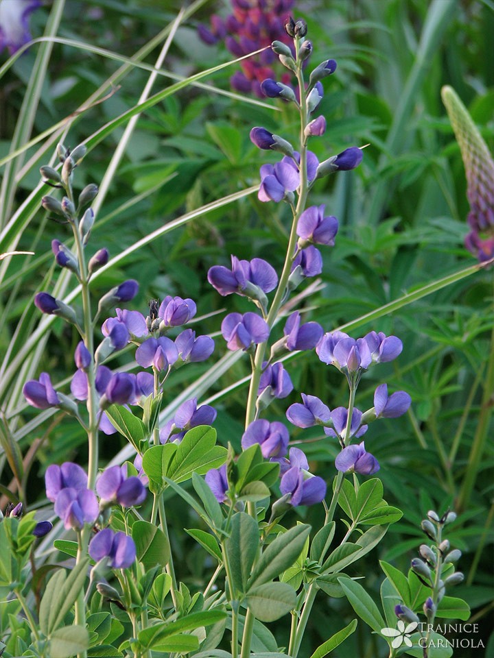 Baptizija je po obliki socvetij skoraj identična volčjemu bobu, le da je njena rast grmaste oblike, listi pa močno spominjajo na grahova. Čeprav njeno temno vijolično, belo ali rumeno cvetje ne traja prav dolgo, jo globoke korenine vzdržujejo privlačno svežo tekom cele sezone.