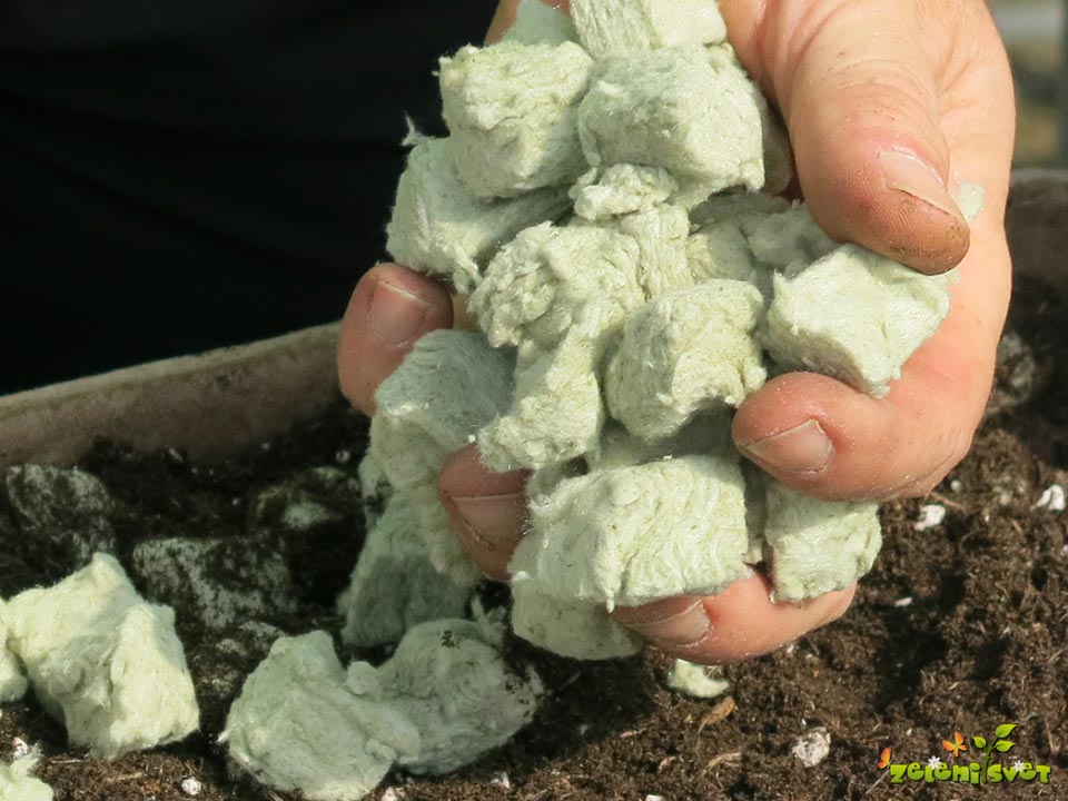 Pozdravljeni, za lončke in korita so blj primerne Zelene kocke. Kosmiče raje porabite v vrtu ali visoki gredi. Lahko z njimi obložite stene loncev, ali pa jih nekoliko narežete, da jih boste lažje zmešali med zemljo v kortih.