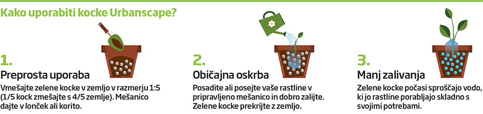 Za boljše zadrževanje in oskrbo z vodo zmešamo med zemljo Urbanscape zelene kocke.