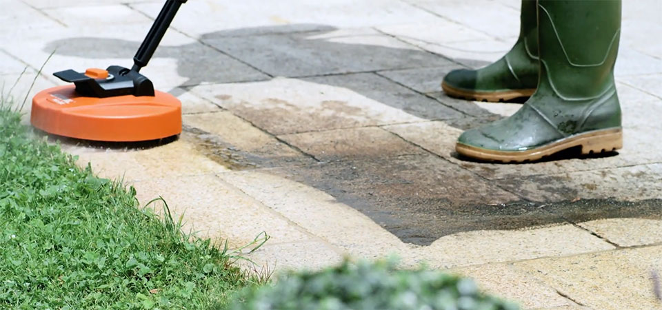 Pri odstranjevanju trdovratne umazanije na tlakovanih površinah, vrtnem orodju in ostalih površinah, ki niso občutljive na poškodbe, se z nastavkom bolj približamo viru umazanije in delamo z večjim tlakom.