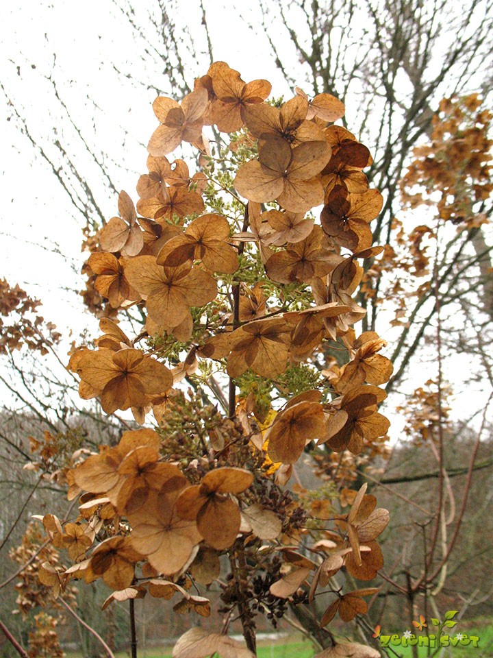 Ne pozabimo na suho cvetje. Posušene cvetove grmovnic kot so hortenzija in pa obstoječe suhe nadzemne dele zelnatih trajnic, v vrtu pustimo kot suhi okras do pomladi.