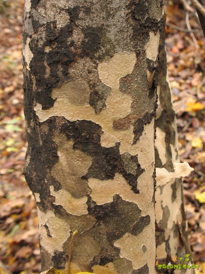 Prepoznavni in slikoviti znak platane je luščenje debelne skorje v ploščicah in lupinah. Isto lastnost imajo v starosti parocija, stevartija (neprava kamelija), japonski dren cvetnik in pa bori.
