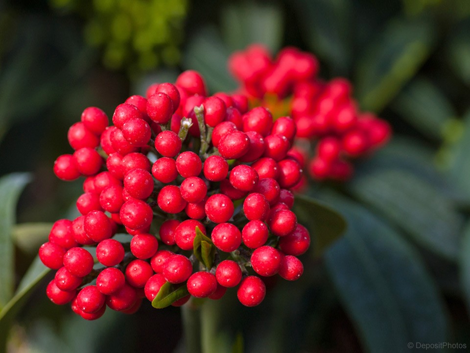 Zelo atraktivne zimzelene grmovnice z rdečimi plodovi sta japonska skimija in gaulterija. Skimija je dvodomna grmovnica, zato je potrebno poleg rastlin z ženskimi cvetovi posaditi tudi kakšno grmovnico z moškimi cvetovi, da nastavijo za grah velike plodove.