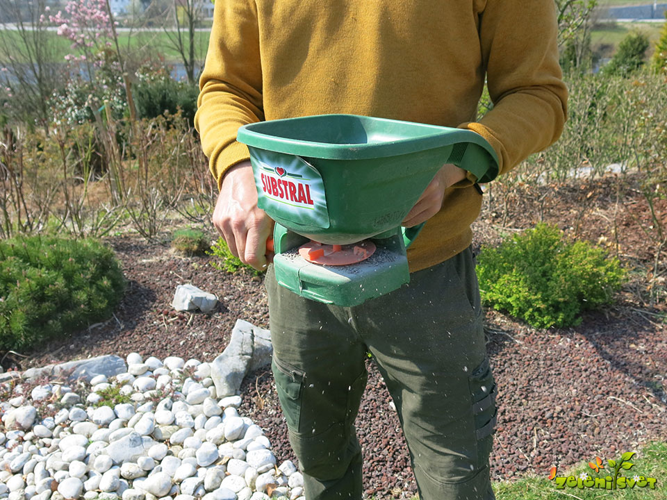 Okrasne gredice okopljemo in pognojimo rastline. Tako preprečimo razraščanje plevela in oskrbimo rastline s hranili, ki jih potrebujejo za rast. Za dognojevenje uporabimo organsko gnojilo drobnejše granulacije, ki deluje dolgotrajno.