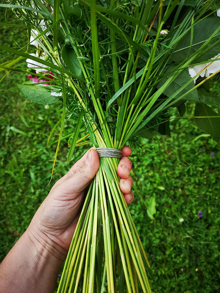 Po parih dneh lahko zeliščni šopek obesite in posušite. Da vam stebelca ne bodo ob sušenju izpadala, šopek naknadno zavežite z elastiko, ki sledi oženju veznega mesta ob postopku sušenja.